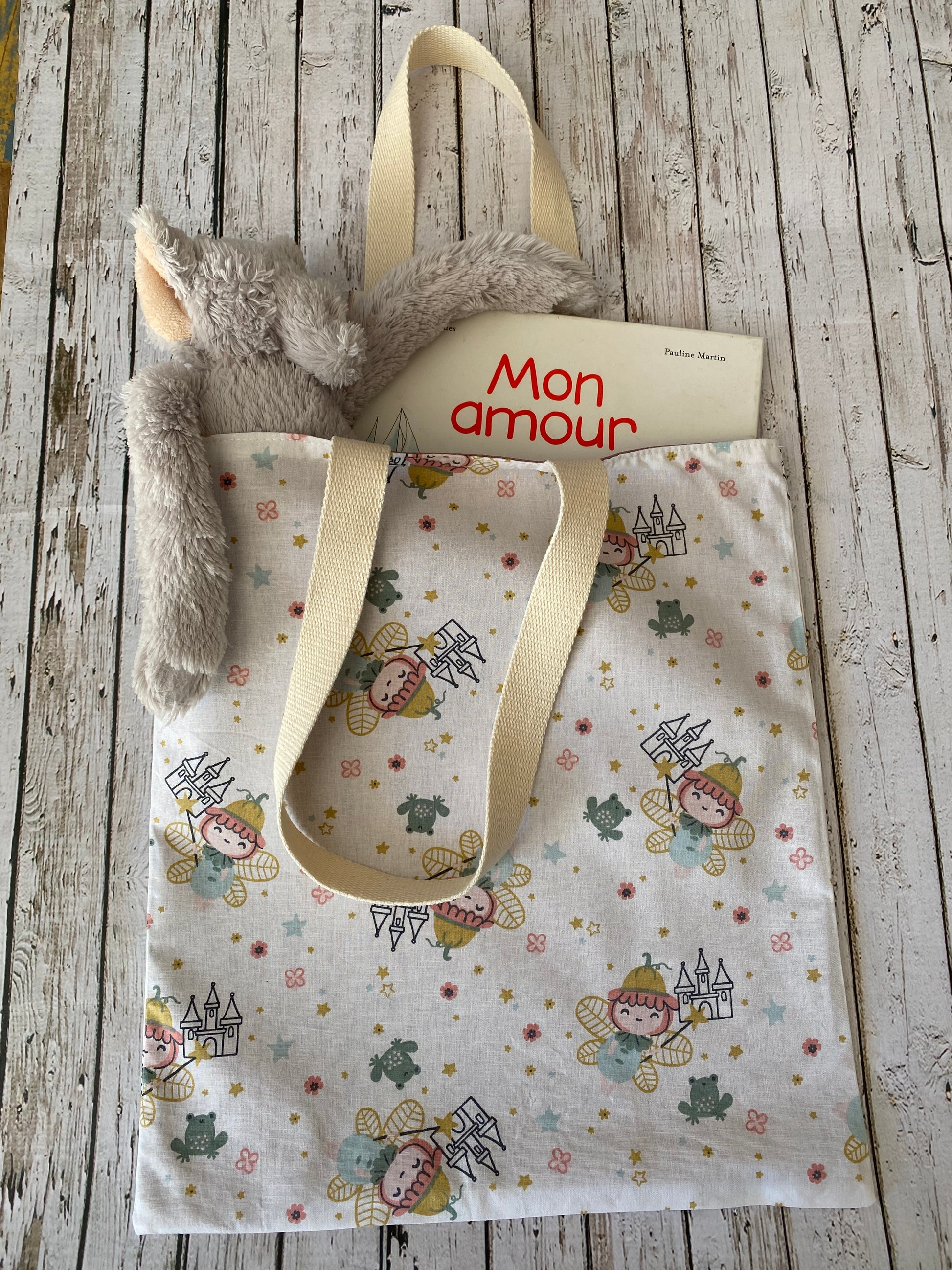Jolie petit tote bag fée parfait pour ramener les livres de la bibliothèque de l'école , pour avoir son doudou à ses côtés ou pour le change en cas de fuite 🤭
